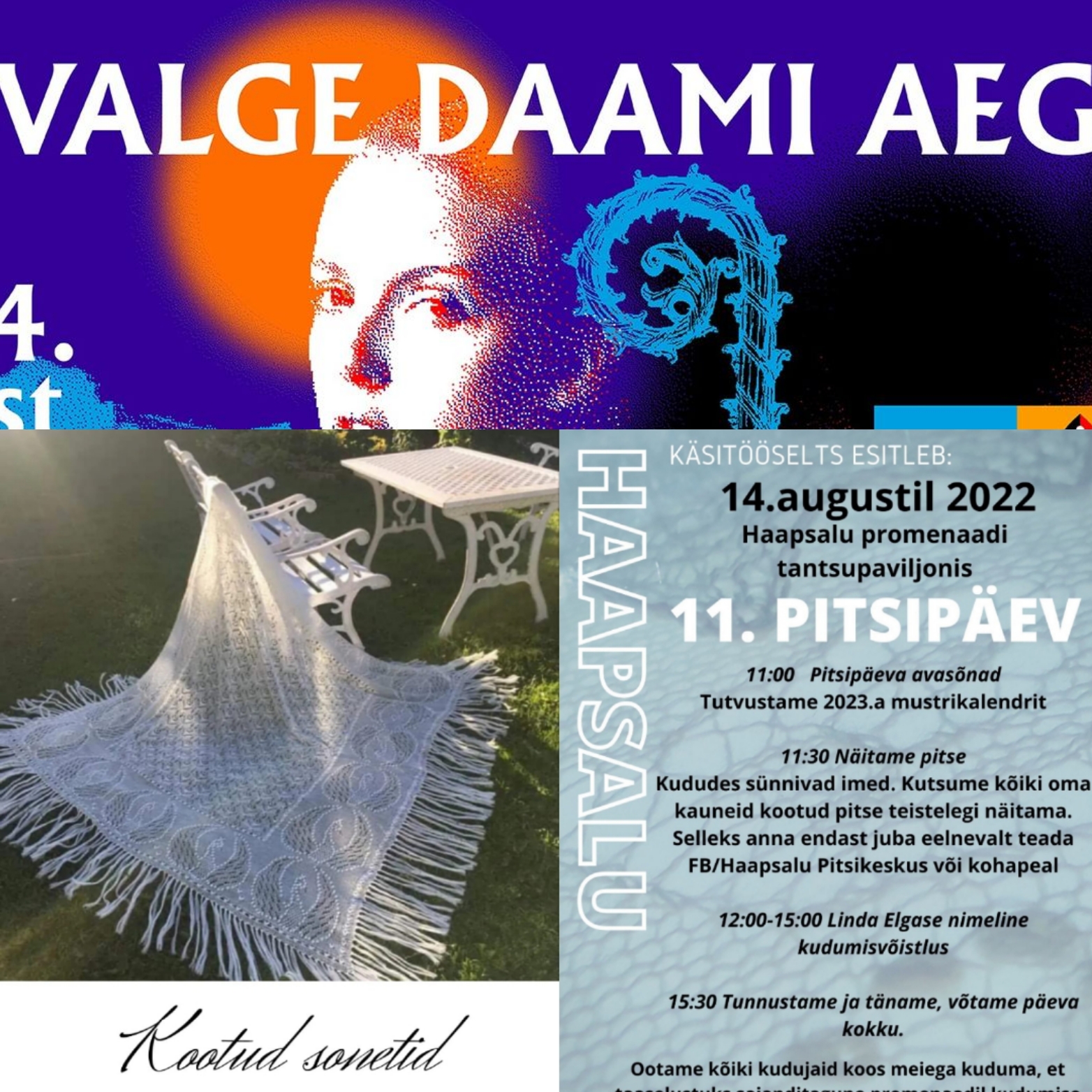 11:30 Näitame pitse. Kududes sünnivad imed. Kutsume kõiki oma kauneid kootud pitse teistelegi näitama. Selleks anna endast juba eelnevalt teada FB/Haapsalu Pitsikeskus või kohapeal
