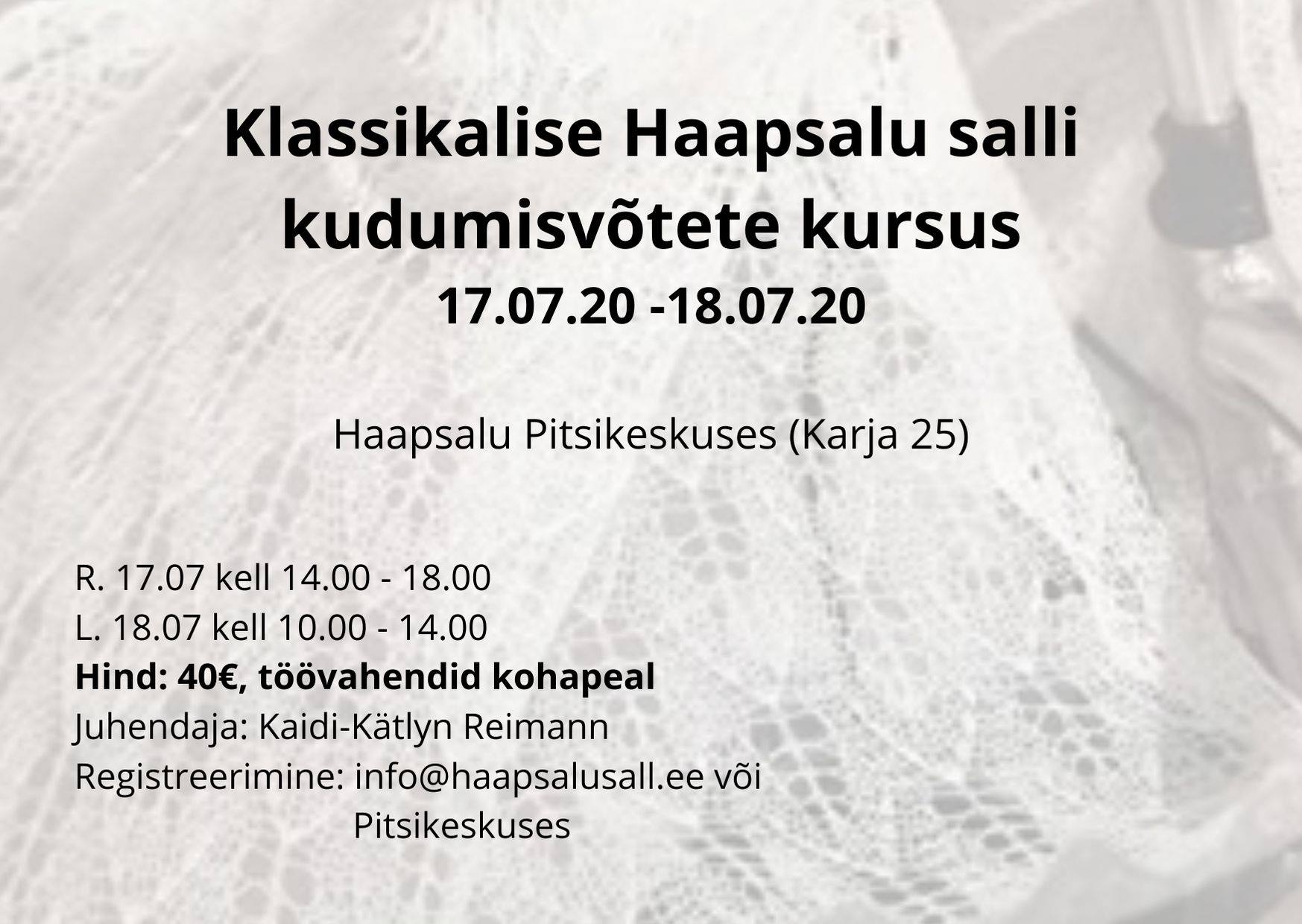 17.07.2020 – 16:09Klassikalise Haapsalu salli kudumisvõtete kursusKursusele on oodatud Haapsalu pitsikudumise saladustesse pühenduda soovijad. Kaidi-Kätlyn on noore põlvkonna kudujate parim esindaja. Just tema õpetuste järgi valmib kursuse lõpuks tööproov, mille valmimiseks tehakse läbi kõik sallikudumise töövõtted ja etapid.Kohvi ja tee pitsikeskuselt, positiivne meeleolu osalejatelt!