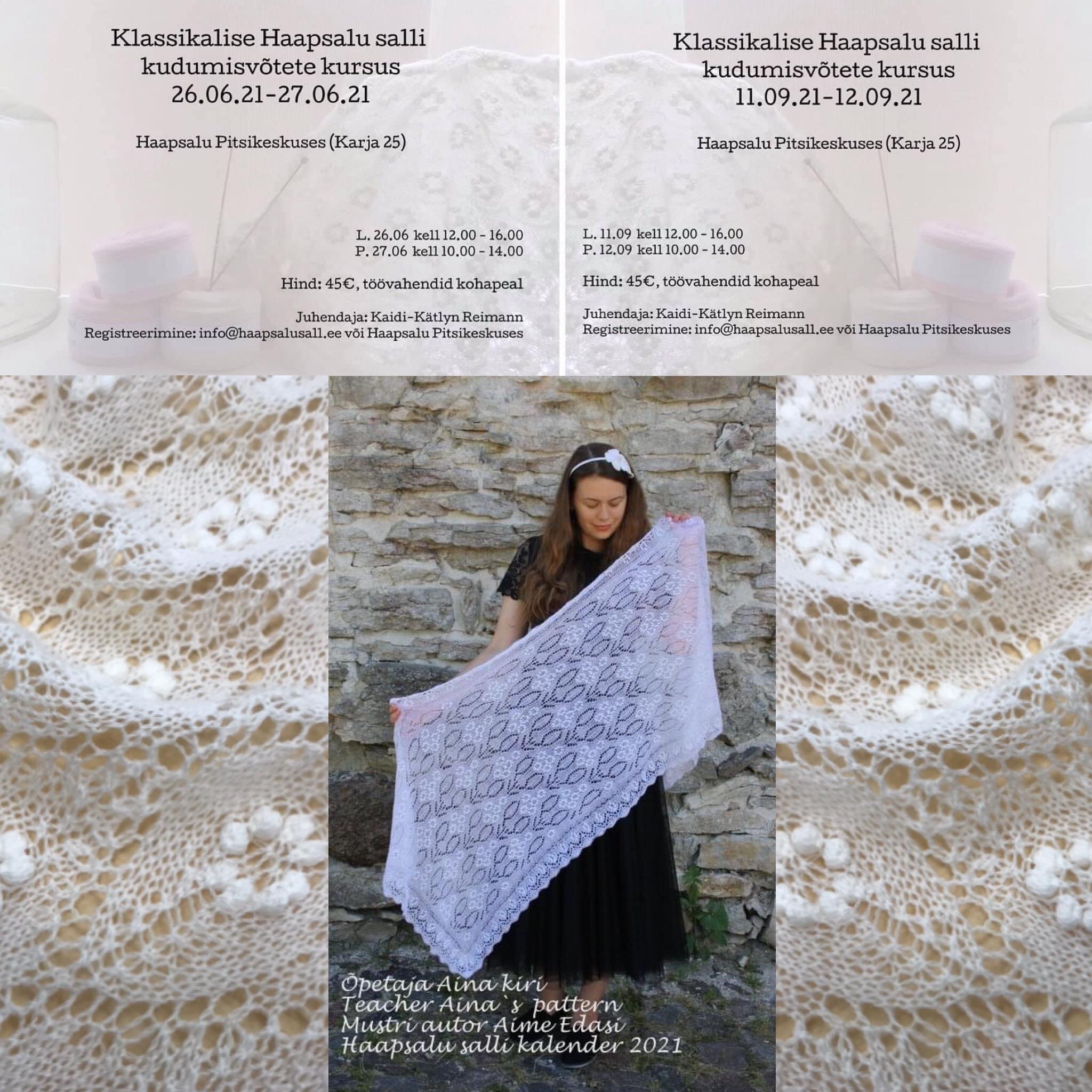 11.09.2021 – 17:13Looduse Omnibuss soovitab: Klassikalise Haapsalu salli kudumisvõtete kursus11.09.2021 – 12.09.2021 toimub Haapsalu Pitsikeskuses klassikalise Haapsalu salli kudumisvõtete kursus.Kursusele on oodatud Haapsalu pitsikudumise saladustesse pühenduda soovijad. Kaidi – Kätlyn on noore põlvkonna kudujate parim esindaja. Just tema õpetuste järgi valmib kursuse lõpuks tööproov, mille valmimiseks tehakse läbi kõik sallikudumise töövõtted ja etapid.Kõik huvilised on oodatud !Info ja registreerimine info@haapsalusall.ee