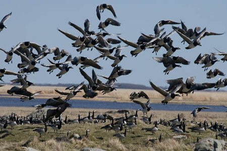 Valgepõsk-lagled (Branta leucopsis) Matsalu Rahvuspargis 2007 aasta kevadel. Foto Toomas Tuul.